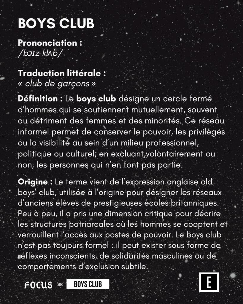 Le boys club désigne un cercle fermé d’hommes qui se soutiennent mutuellement, souvent au détriment des femmes et des minorités.