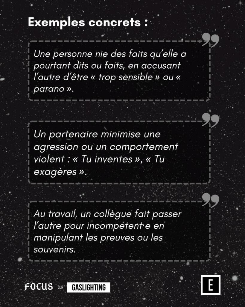 - En couple : Un partenaire minimise une agression en disant « Tu inventes » ou « Tu es trop sensible ».