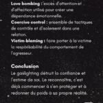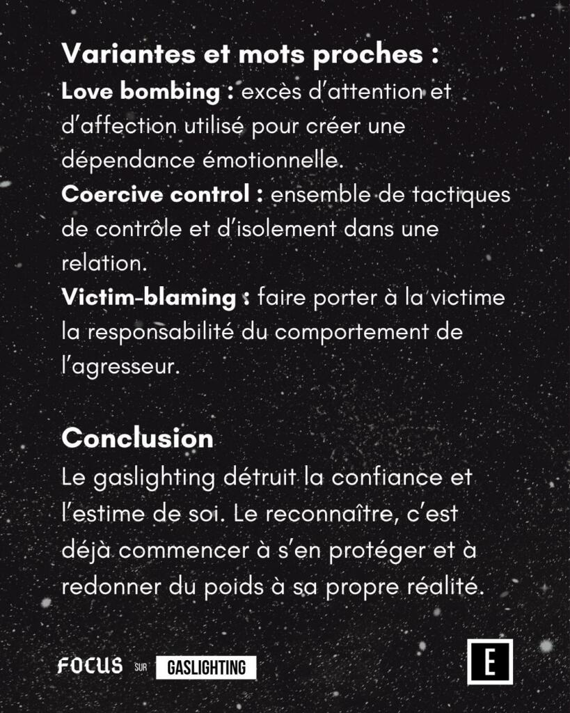 Notions associées : love bombing (attentions excessives pour créer une dépendance), coercive control (contrôle coercitif et isolement), victim-blaming (culpabiliser la victime).