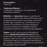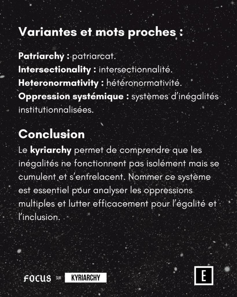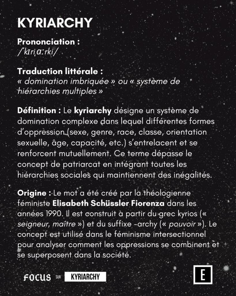 Le kyriarchy désigne un système de domination complexe dans lequel différentes formes d’oppression, sexe, genre, race, classe, orientation sexuelle, âge, capacité, etc.,s’entrelacent et se renforcent mutuellement. Ce concept dépasse celui de patriarcat en intégrant toutes les hiérarchies sociales qui maintiennent des inégalités.