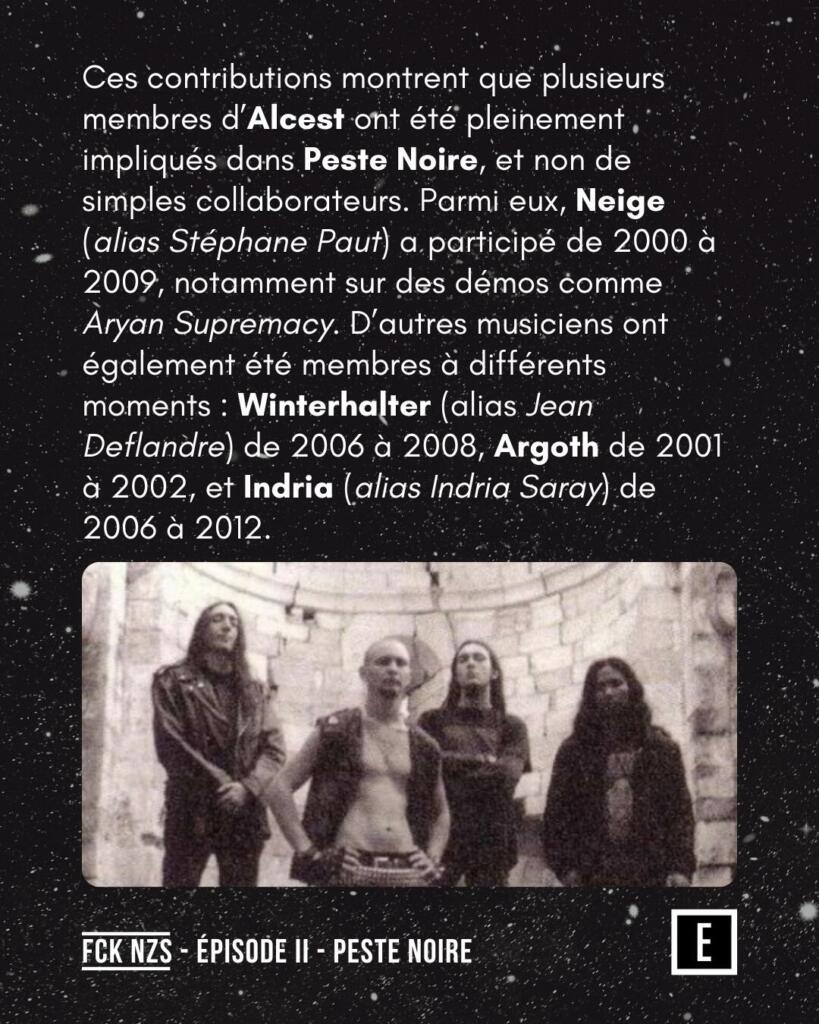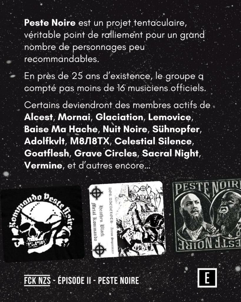 Peste Noire est un projet tentaculaire, point de ralliement pour des personnes peu recommandables. En 25 ans, le groupe a compté 16 musiciens officiels, certains devenant membres d’Alcest, Mornai, Glaciation, Lemovice, Baise Ma Hache, Nuit Noire, Sühnopfer, Adolfkvlt, М8Л8ТХ, Celestial Silence, Goatflesh, Grave Circles, Sacral Night, Vermine, etc.