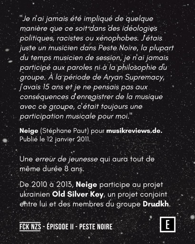 « Je n’ai jamais été impliqué de quelque manière que ce soit dans des idéologies politiques, racistes ou xénophobes. J’étais juste un musicien dans Peste Noire, la plupart du temps musicien de session, je n’ai jamais participé aux paroles ni à la philosophie du groupe. À la période de Aryan Supremacy, j’avais 15 ans et je ne pensais pas aux conséquences d’enregistrer de la musique avec ce groupe, c’était toujours une participation musicale pour moi.«