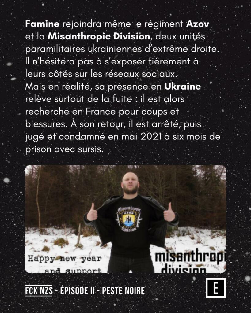 Famine rejoint le régiment Azov et la Misanthropic Division, unités paramilitaires ukrainiennes d’extrême droite, et s’expose sur les réseaux sociaux. Il est arrêté à son retour en France et condamné en mai 2021 à six mois de prison avec sursis.