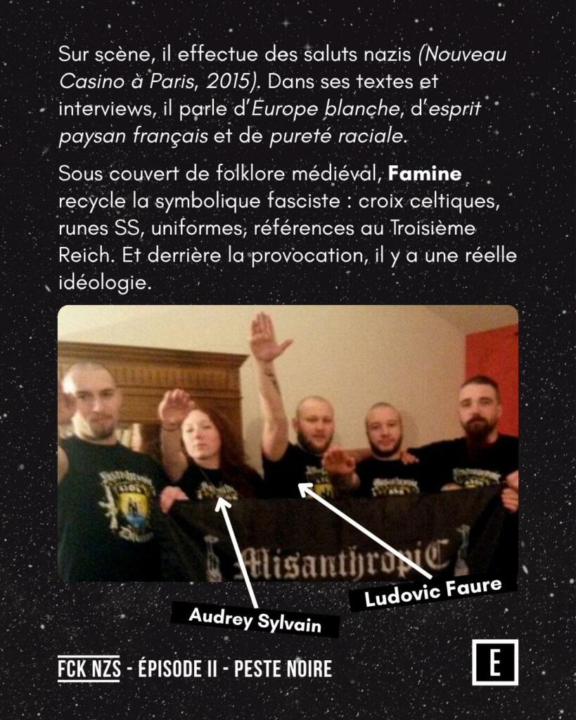 Sur scène, il effectue des saluts nazis (Nouveau Casino à Paris, 2015). Dans ses textes et interviews, il parle d’Europe blanche, d’esprit paysan français et de pureté raciale. Sous couvert de folklore médiéval, Famine recycle la symbolique fasciste : croix celtiques, runes SS, uniformes, références au Troisième Reich. Derrière la provocation se cache une réelle idéologie.