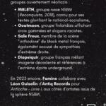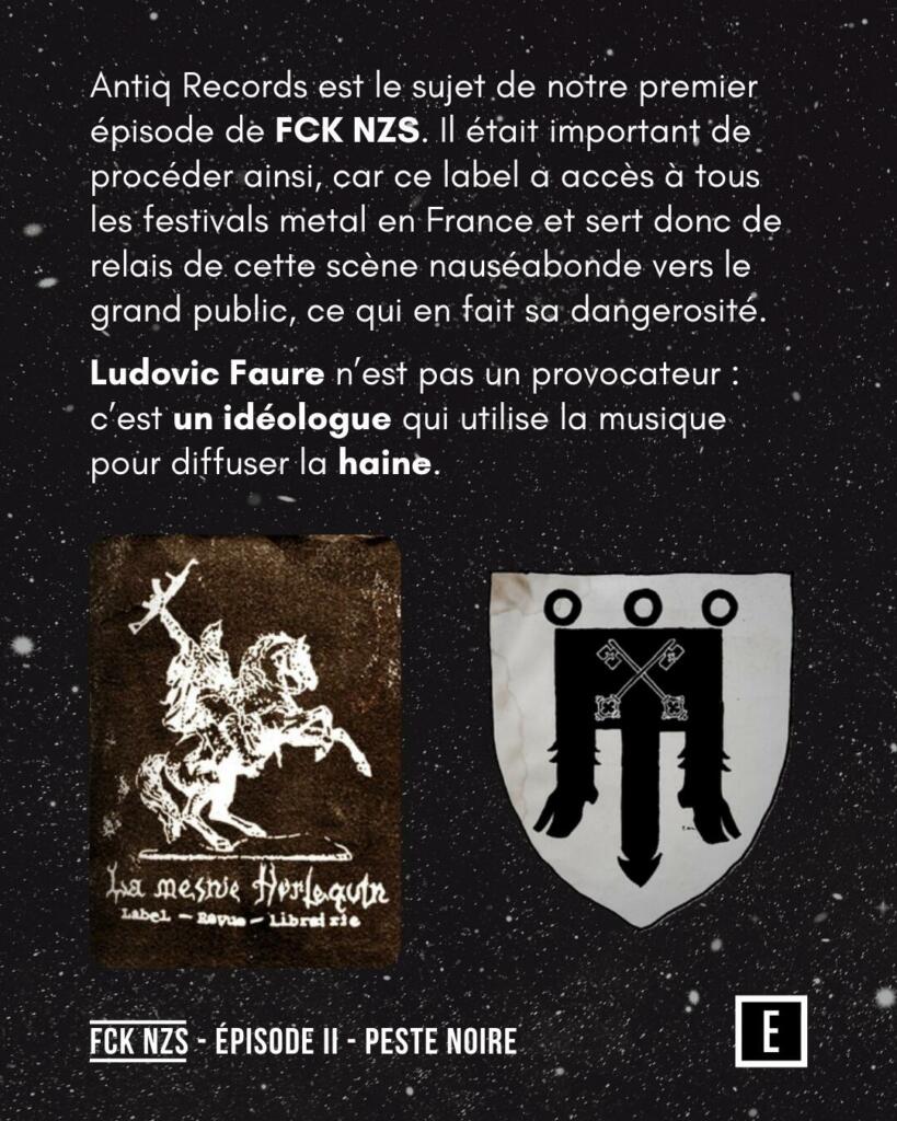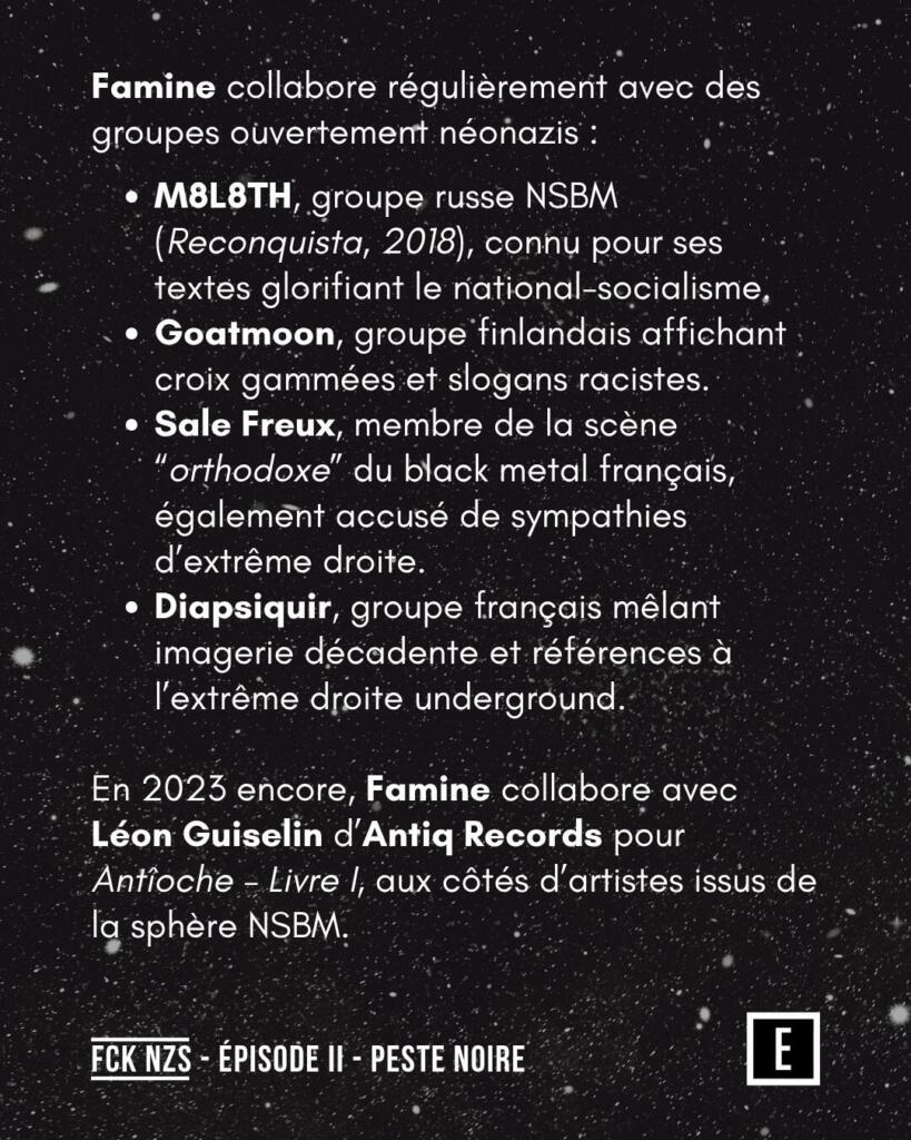 En 2023, Famine collabore avec Léon Guiselin d’Antiq Records pour Antîoche – Livre I, aux côtés d’artistes issus de la sphère NSBM. Antiq Records, sujet du premier épisode de FCK NZS, a accès à tous les festivals metal en France, ce qui amplifie la diffusion de cette scène.