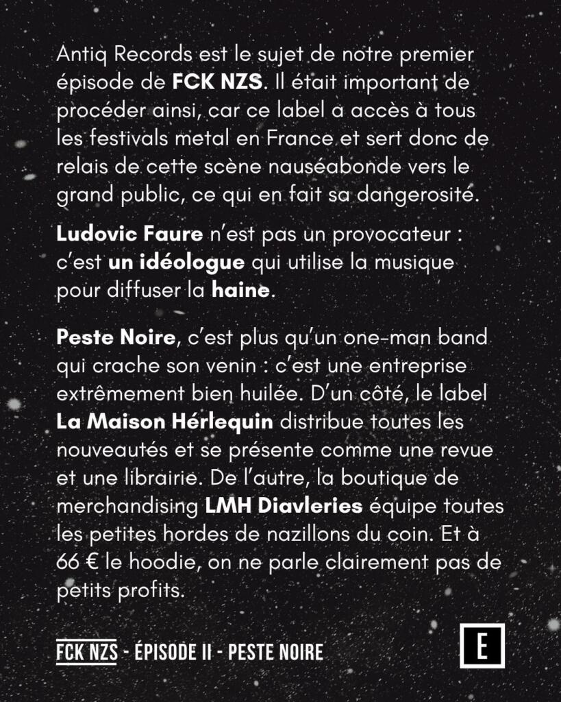 Peste Noire n’est pas qu’un projet musical : c’est une entreprise bien organisée. Le label La Maison Hérlequin distribue les nouveautés et se présente comme une revue et une librairie. La boutique LMH Diavleries équipe les groupes d’extrême droite locaux, à 66 € le hoodie, prouvant que ce n’est pas un petit profit.