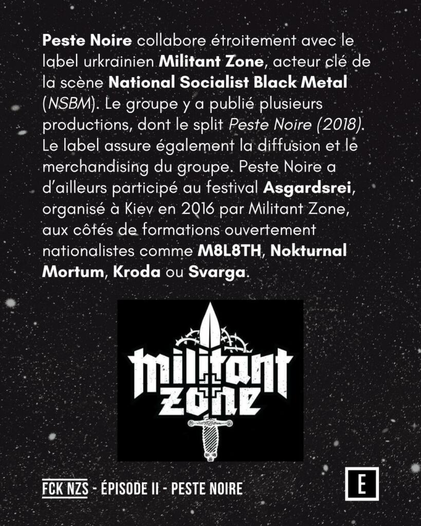 Peste Noire collabore avec le label ukrainien Militant Zone, acteur clé de la scène NSBM. Le groupe y a publié plusieurs productions, dont le split Peste Noire (2018), et a participé au festival Asgardsrei à Kiev en 2016, aux côtés de M8L8TH, Nokturnal Mortum, Kroda ou Svarga.