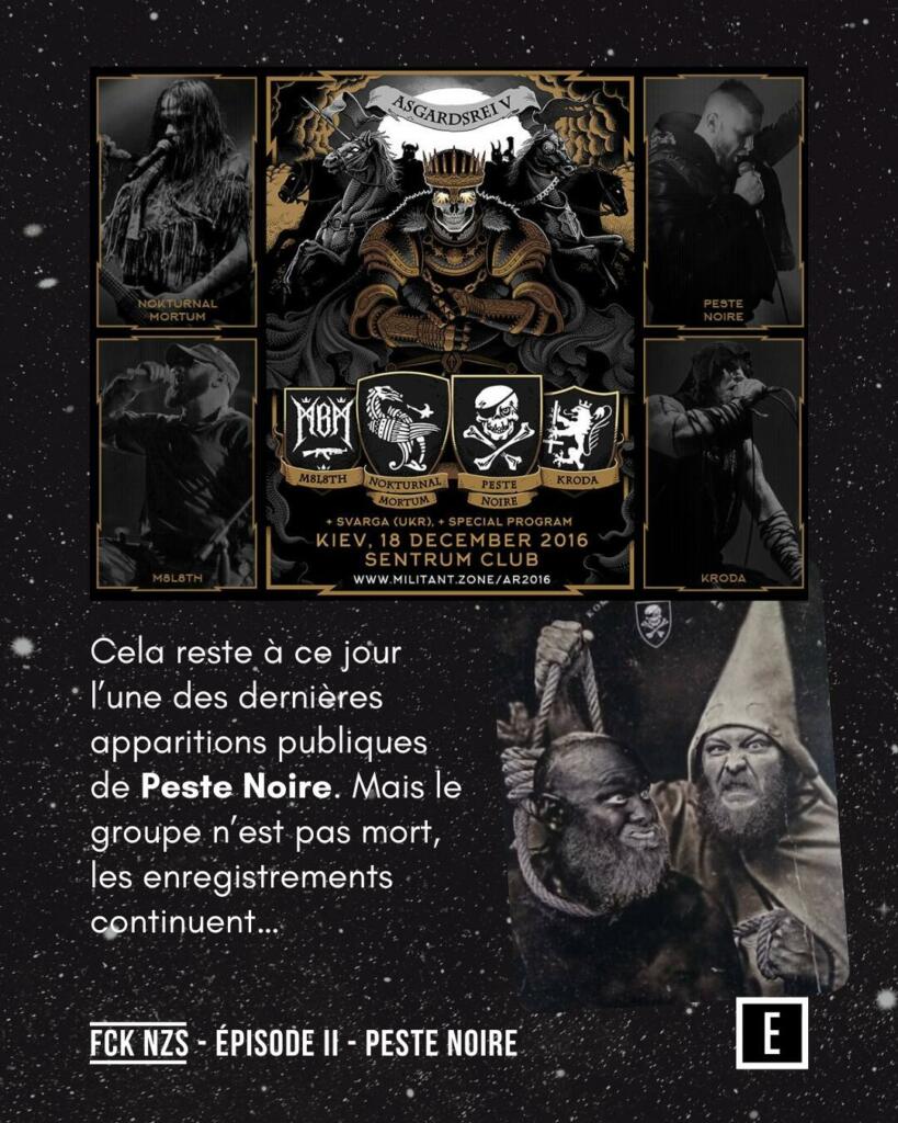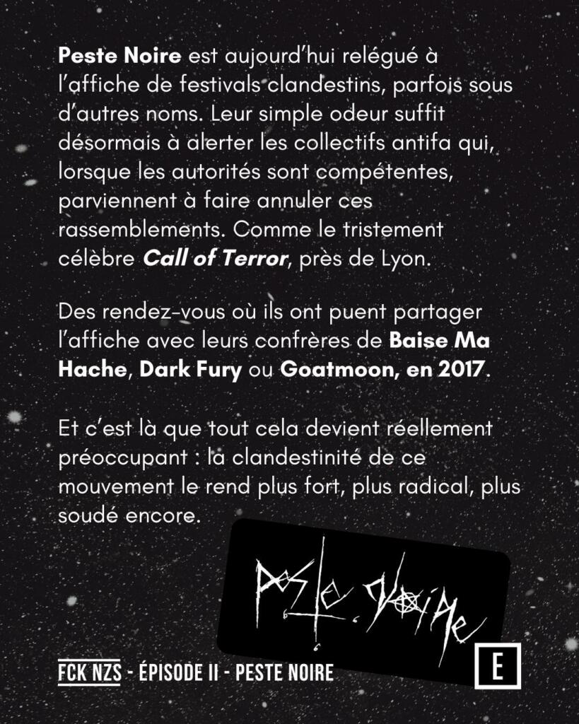 Aujourd’hui, Peste Noire se produit dans des festivals clandestins, parfois sous d’autres noms. Leur présence alerte les collectifs antifascistes qui réussissent parfois à faire annuler ces événements, comme le tristement célèbre Call of Terror près de Lyon en 2017.