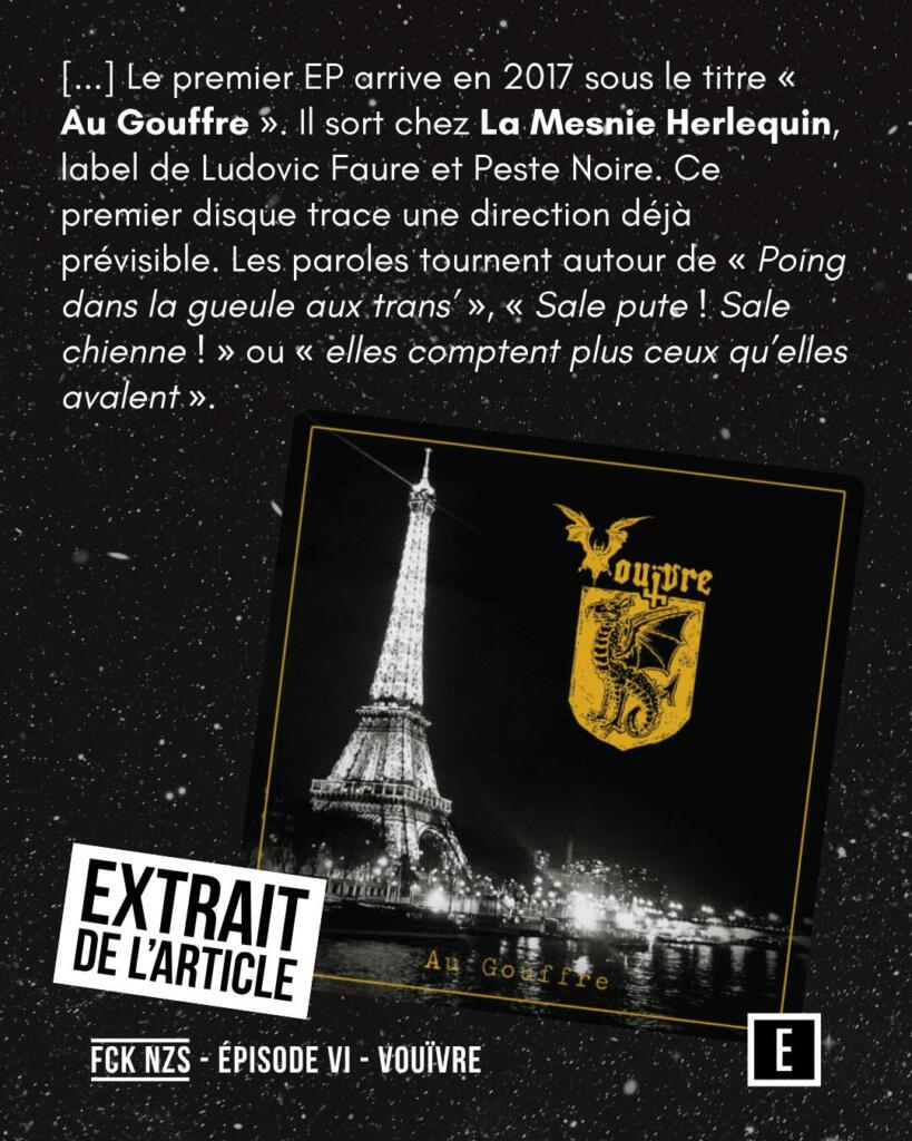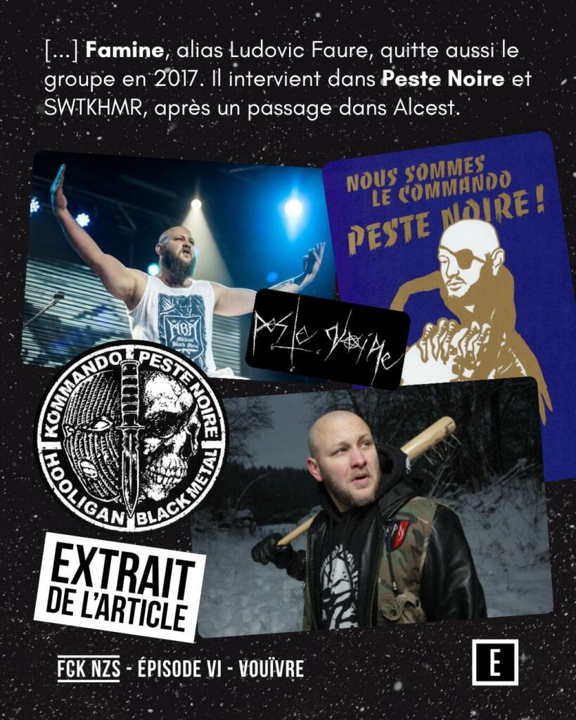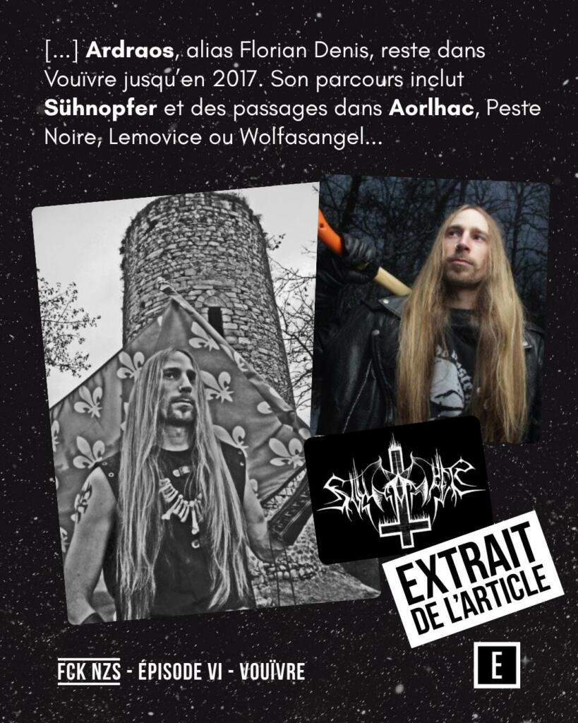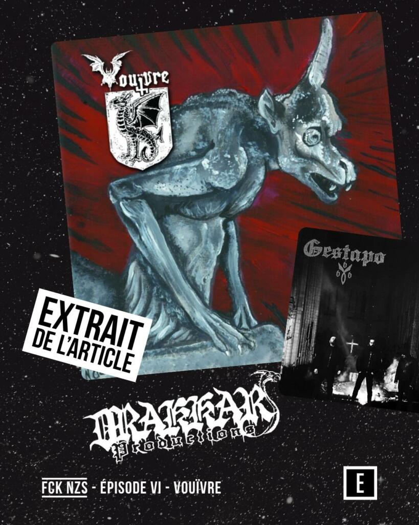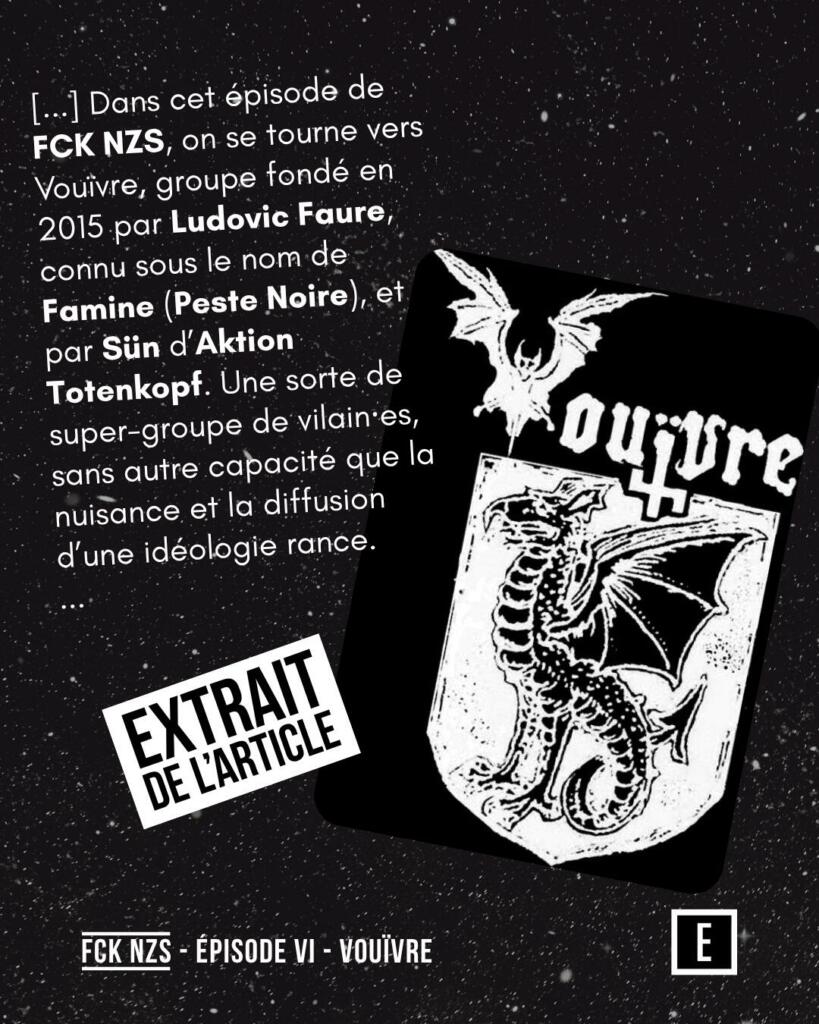 Dans cet épisode de FCK NZS, on se tourne vers Vouïvre, groupe fondé en par Ludovic Faure, connu sous le nom de Famine (Peste Noire), et par Sün d’Aktion Totenkopf. Une sorte de super-groupe de vilain·es, sans autre capacité que la nuisance et la diffusion d’une idéologie rance. Cet épisode agit comme un zoom sur ce qui, à mon sens, représente ce que la scène NSBM (National Socialist Black Metal) française a produit de pire ces dernières années. À côté de cela, Peste Noire paraît presque comme un boys band de K-Pop.