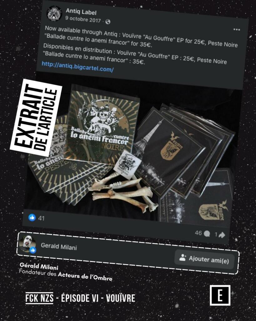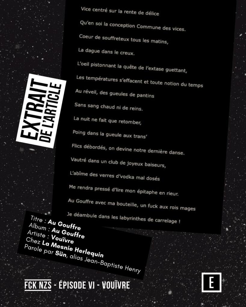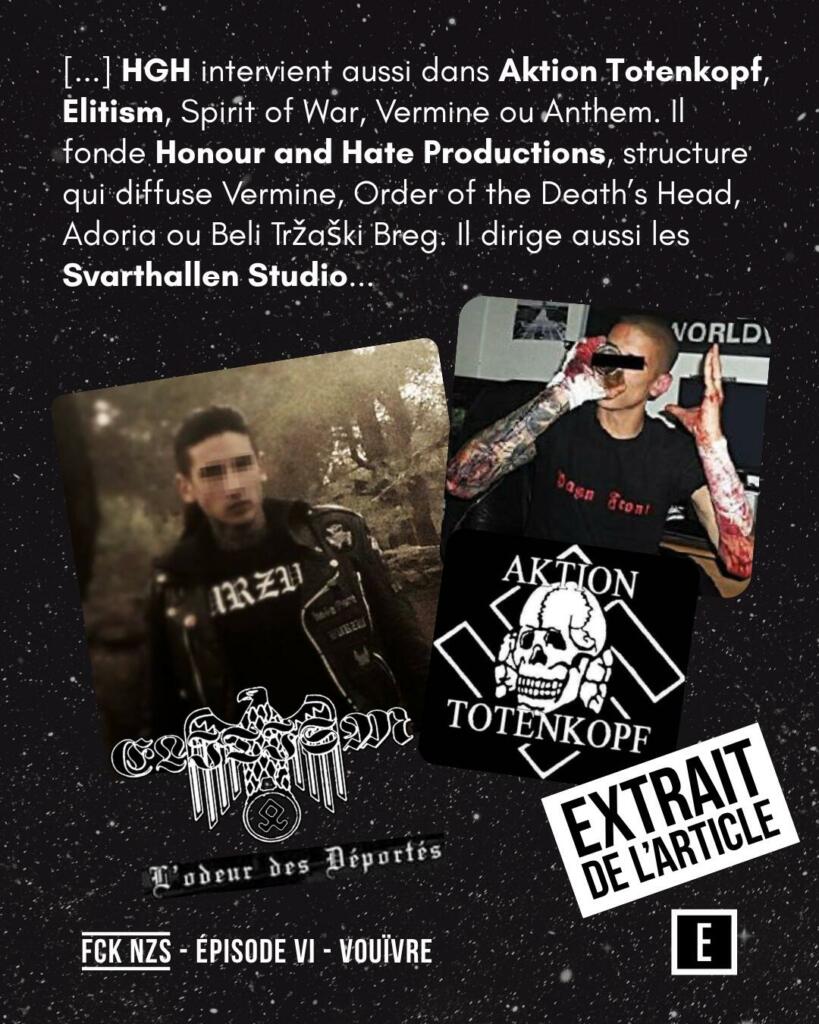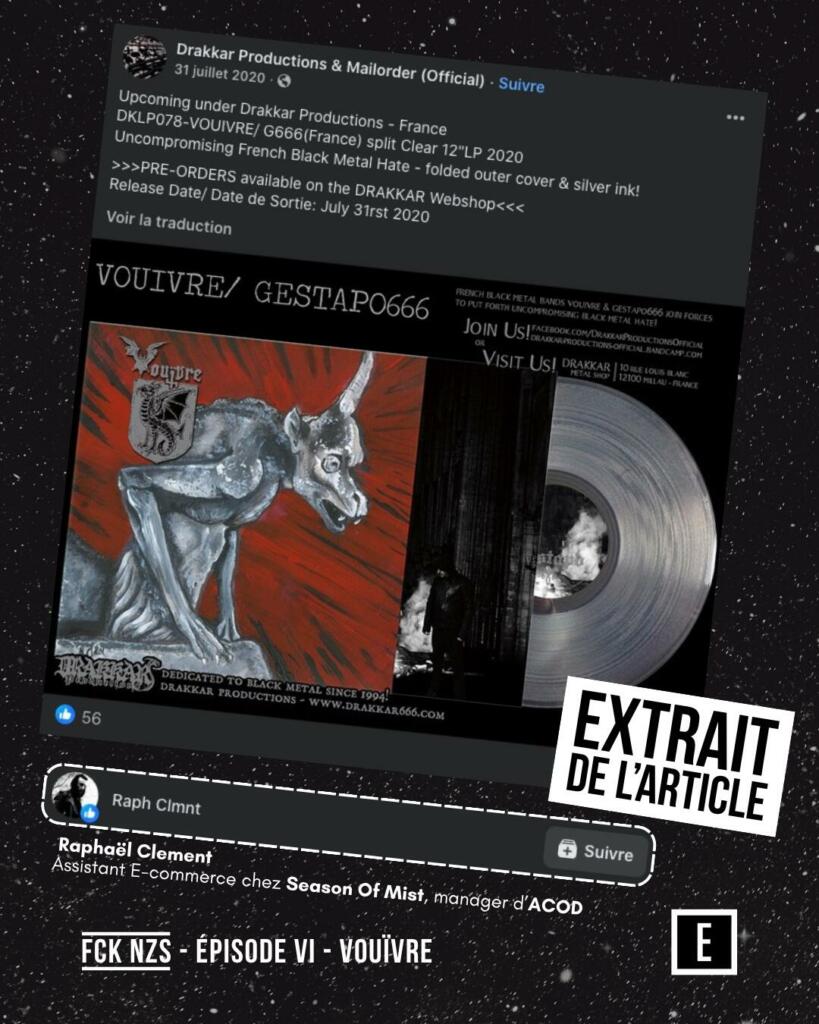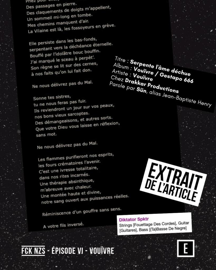 Dans cet épisode de FCK NZS, on se tourne vers Vouïvre, groupe fondé en par Ludovic Faure, connu sous le nom de Famine (Peste Noire), et par Sün d’Aktion Totenkopf. Une sorte de super-groupe de vilain·es, sans autre capacité que la nuisance et la diffusion d’une idéologie rance. Cet épisode agit comme un zoom sur ce qui, à mon sens, représente ce que la scène NSBM (National Socialist Black Metal) française a produit de pire ces dernières années. À côté de cela, Peste Noire paraît presque comme un boys band de K-Pop.