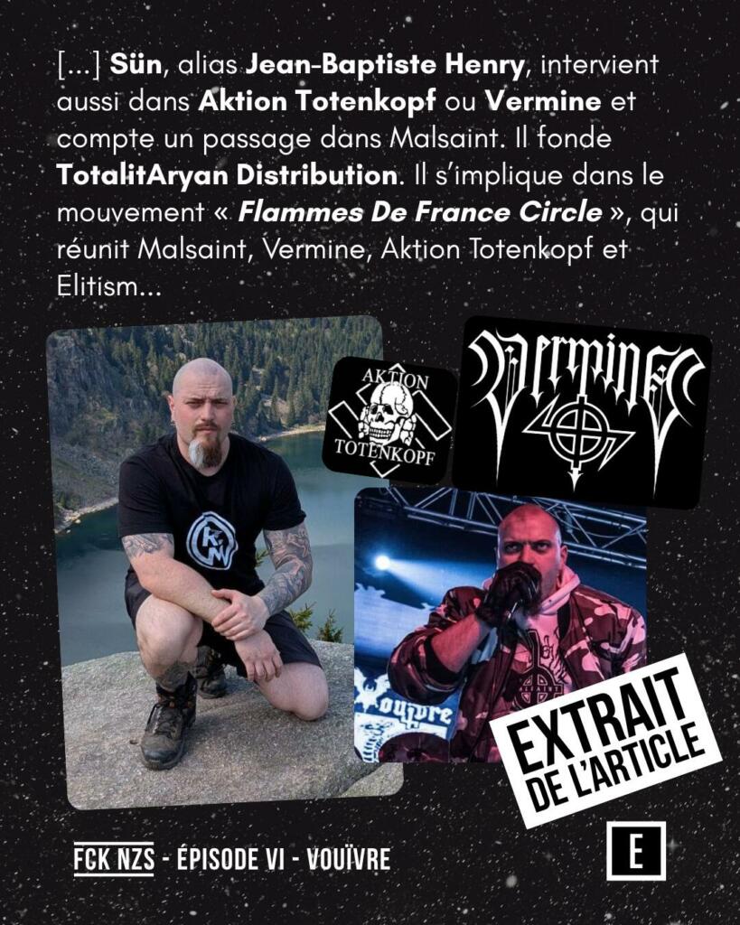 Sün, alias Jean-Baptiste Henry, intervient aussi dans Aktion Totenkopf ou Vermine et compte un passage dans Malsaint. Il fonde TotalitAryan Distribution. Il s’implique dans le mouvement « Flammes De France Circle », qui réunit Malsaint, Vermine, Aktion Totenkopf et Elitism, et publie la compilation « Flammes De France – Opus 1 » chez Darker Than Black, label d’Hendrik Möbus, meurtrier, suprémaciste et chanteur du groupe Absurd. Puis « Flammes De France – Opus II » chez Sang & Sol Productions, avec Malsaint, Baise Ma Hache, Phosphore Blanc, Elitism, Sacrificia Mortuorum, Aktion Totenkopf, Chevrotine et Order Of The Death’s Head. L’ensemble s’inscrit dans un entre-soi assumé.