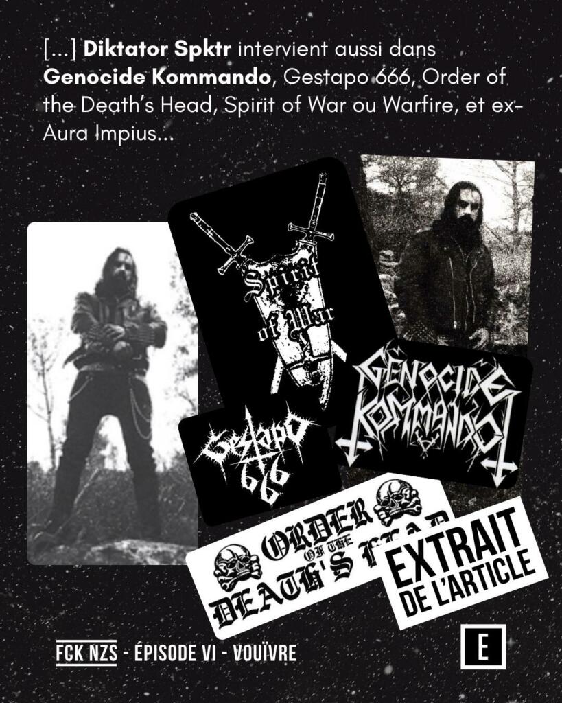 Diktator Spktr intervient aussi dans Genocide Kommando, Gestapo 666, Order of the Death’s Head, Spirit of War ou Warfire, et ex-Aura Impius.