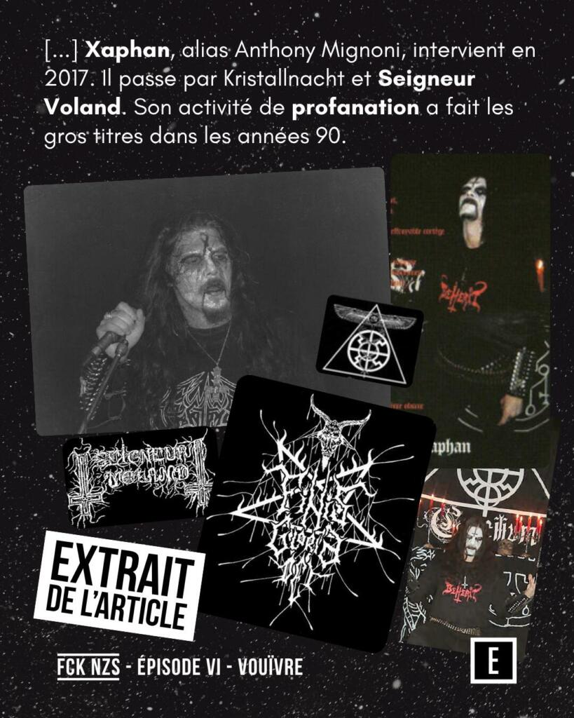 Xaphan, alias Anthony Mignoni, intervient en . Il passe par Kristallnacht et Seigneur Voland. Son activité de profanation a fait les gros titres dans les années 90. Il est également membre des Charlemagne Hammer Skins.